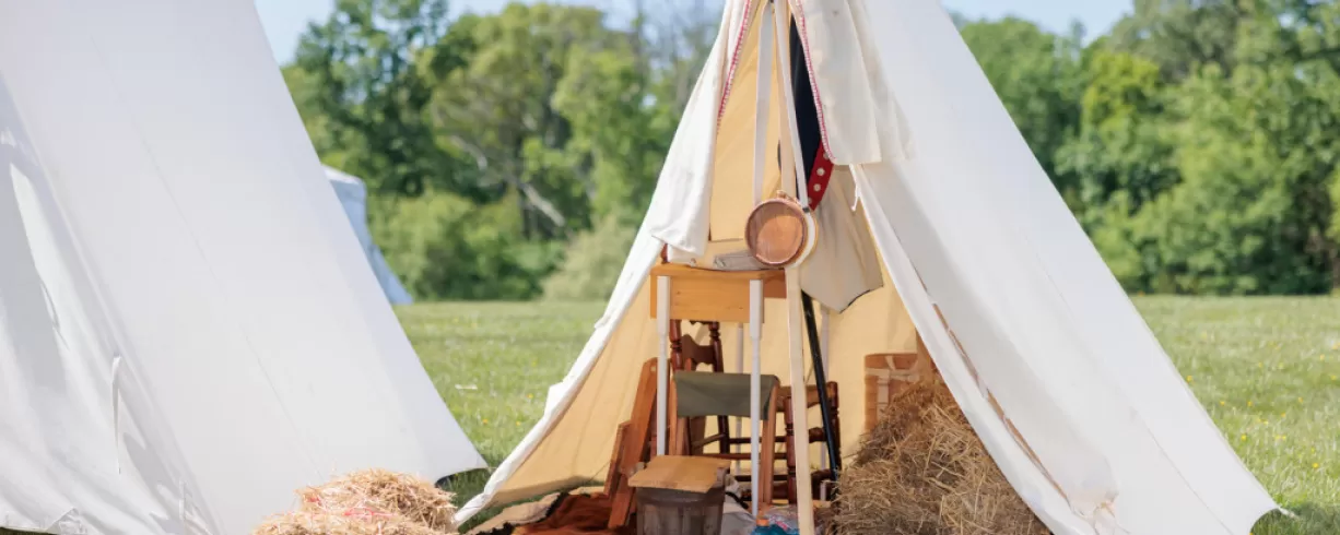 Immerse yourself in the daily life of soldiers, military officers, and the camp followers who traveled with the army as you explore a Revolutionary War encampment. At this hands-on attraction, you can touch the items inside the soldiers' tents and officer's tent, wash clothes in the laundry yard, and examine cooking utensils used by camp followers.