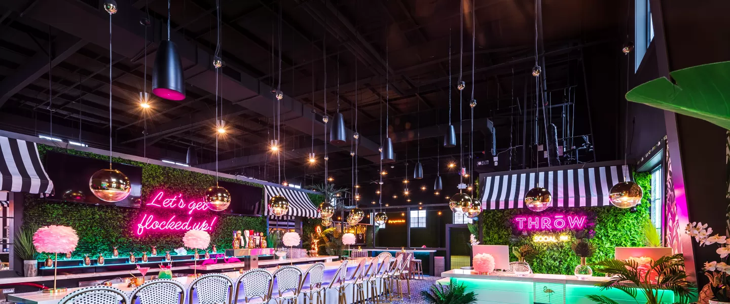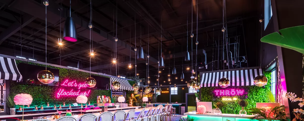 Flamingle upstairs at THRōW Social in an easy, breezy tropical atmosphere. Sip on specialty cocktails, indulge in mouthwatering food, and enjoy live DJs all day (or night!) long. Rent a VIP Cabana, play backyard-style games like corn hole & light-up ping-pong, then dance the night away!