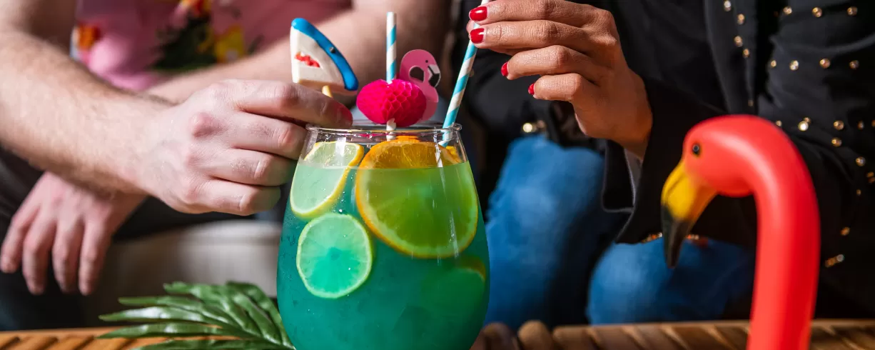 Tropic Like It’s Hot at our one-of-a-kind dual-venue, THRōW Social© & Kick Axe Throwing© DC, where tropical paradise upstairs meets cozy cabin vibes downstairs, under one gorgeous rooftop bar & patio!